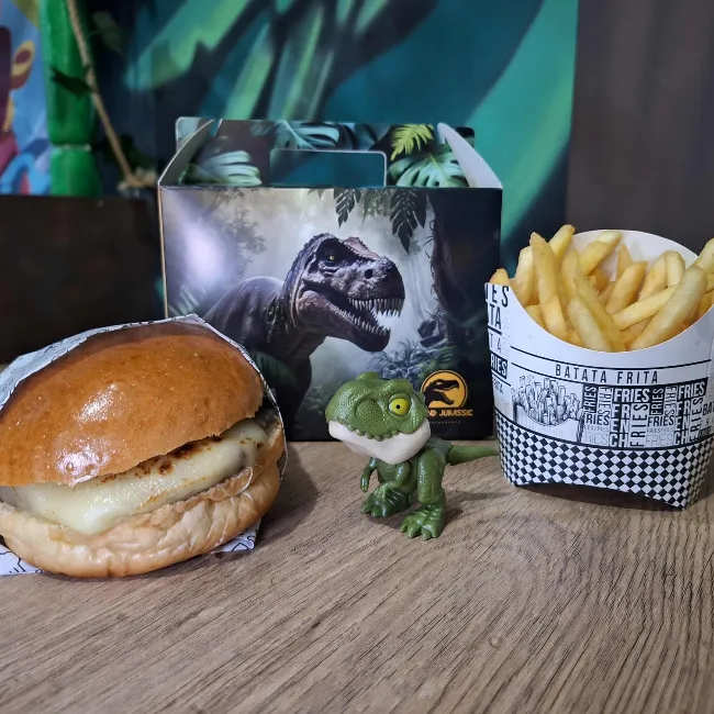 Hambúrguer Jurássico 90g, mussarela e molho especial, no pão brioche Kids + Batata frita + Mini dinossauro morde dedo colecionável