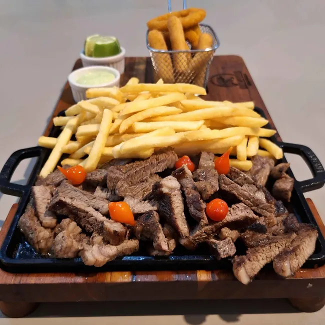 Picanha na grelha 550g, batata frita, 5 Stick de queijo e 5 anel de cebola. Acompanha 1 molho à sua escolha.