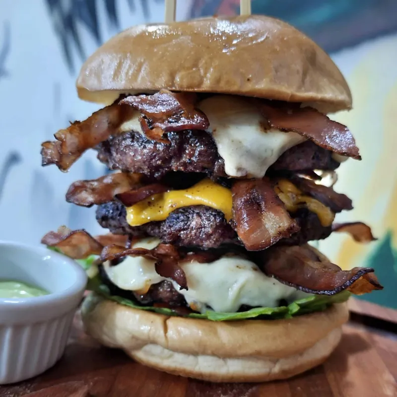 Triplo hambúrguer Jurássico 180g, mussarela, fatias de bacon, cheddar, mais bacon, mais mussarela, alface, tomate cereja e molho especial, no pão brioche